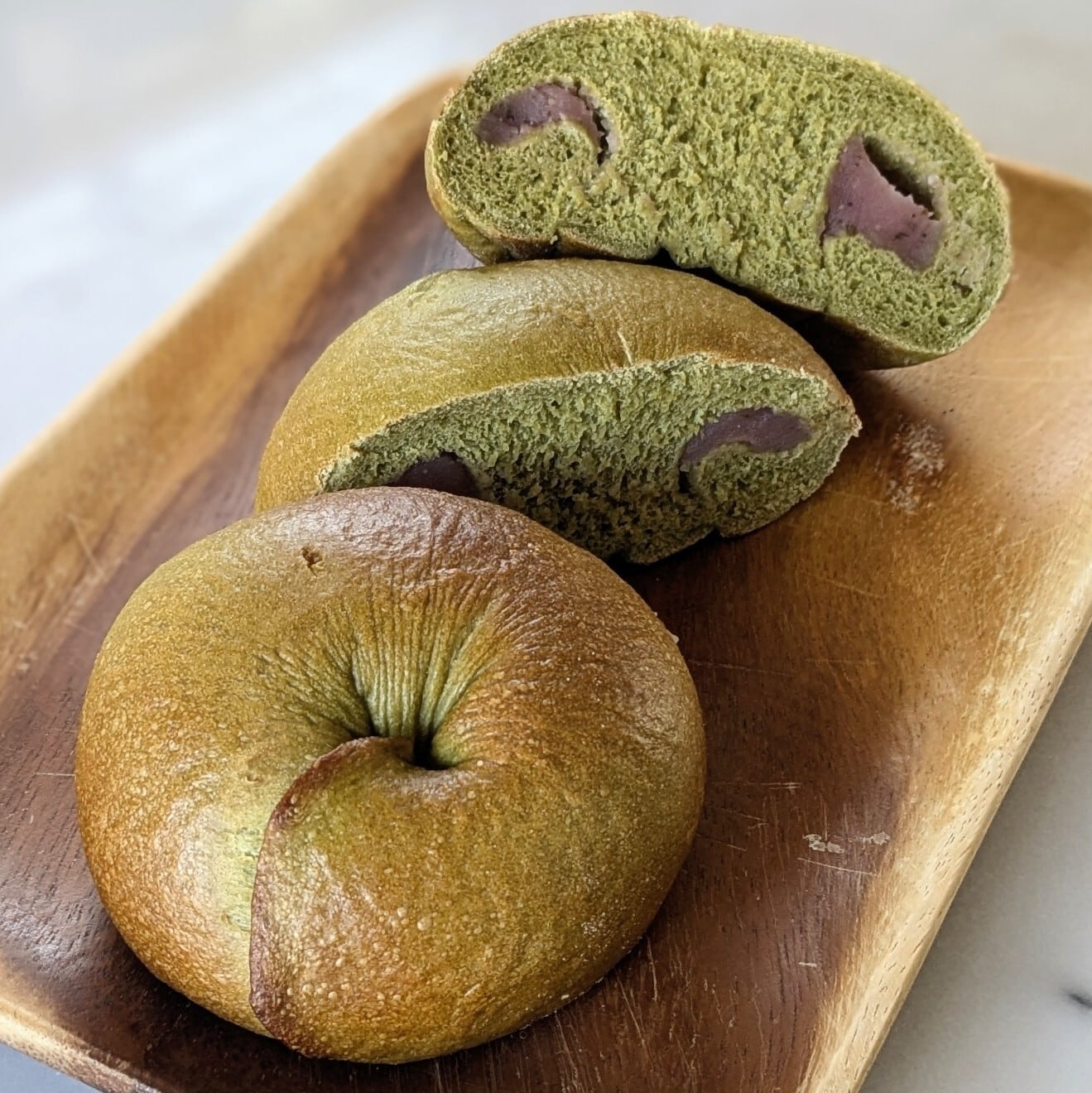 抹茶生地のベーグルに桜あんを入れました。